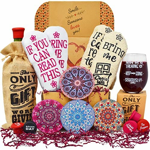 For the Wine Enthusiast: 2 pairs of Funny socks, Stemless Funny glass, Coasters for drinks, Bottle Stoppers and a Bottle tote